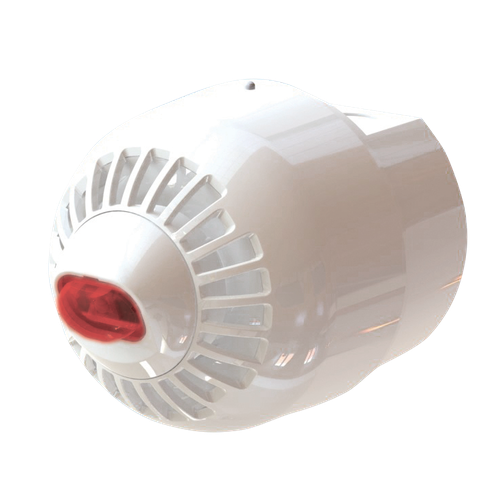 Teknik: 17–32 VDC; 97 ±3 dB(A) @1 m; VAD sınıfı W-3-7.49 (56 m²); gövde rengi beyaz, lens kırmızı; EN54-3 ve EN54-23 sertifikalı.