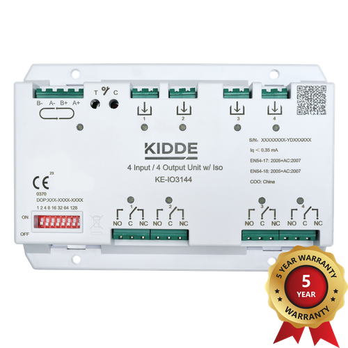 KE-IO3144; Kidde Excellence adresli sistemlerde 4 adet giriş izleme + 4 adet röle çıkış kontrolünü tek adres üzerinden sağlayan I/O modülüdür. Entegre kısa devre hat izolasyonu bulunur ve loop üzerinden beslenir.