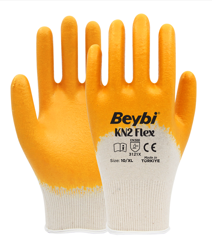 KN2 FLEX 3/4 Nitril Kaplı Pamuk Likralı Örme Eldiven, profesyonel kullanım için geliştirilmiş, yüksek tutuş ve konfor sunan bir iş eldiveni modelidir. Pamuk ve likra karışımı örme astarı sayesinde ele tam oturur, esnek yapısı ile uzun süreli çalışmalarda rahatlık sağlar.