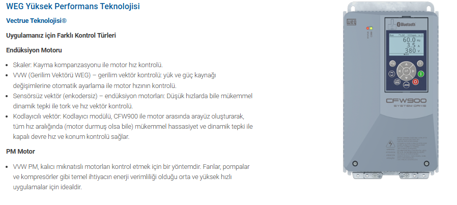 3 kW güç sınıfındaki uygulamalarda yüksek dayanım ve kararlı motor kontrolü sağlayan CFW900A06P5T4DB20Y2B, IP66 tam izolasyonlu yapısı ile zorlu ortamlarda arıza riskini minimuma indirir. Sürücü, WEG’in gelişmiş vektör kontrol algoritmaları sayesinde düşük hızlarda bile yüksek tork üretir. Endüstriyel işletmeler için önemli olan hızlı devreye alma, uzaktan konfigürasyon, kestirimci bakım verilerinin okunması gibi yetenekler CFW900 ile standart olarak sunulur.